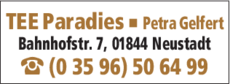 Die Adresse von Gelfert Petra Tee-Paradies lautet: Bahnhofstr. 7, 01844 Neustadt