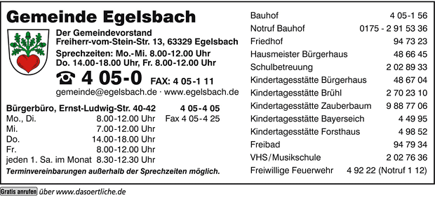 Gemeinde Egelsbach hat montags von 14:00 - 15:30 Uhr und 08:00 - 12:00 Uhr, dienstags bis mittwochs von 08:00 - 12:00 Uhr und donnerstags von 14:30 - 18:30 Uhr geöffnet.