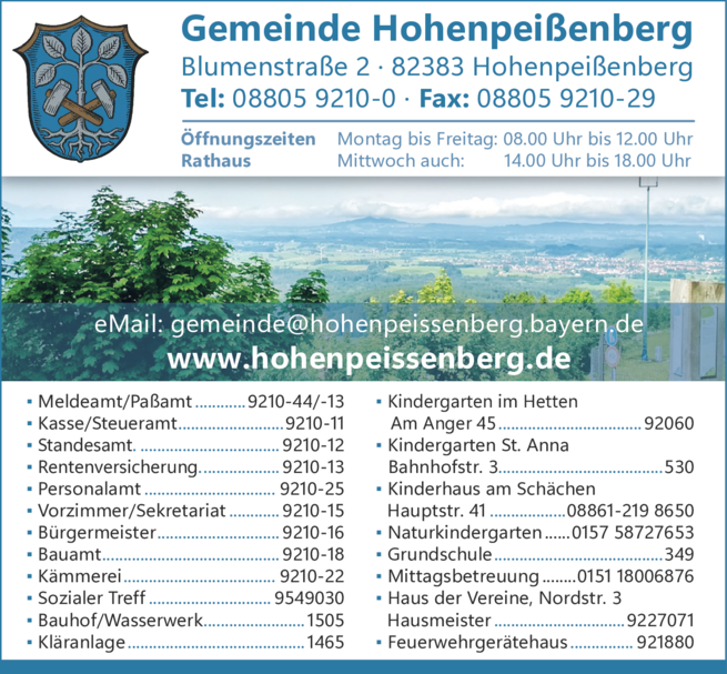 Gemeinde Hohenpeißenberg hat montags bis dienstags von 08:00 - 12:00 Uhr, mittwochs von 08:00 - 12:00 Uhr und 14:00 - 18:00 Uhr und donnerstags bis freitags von 08:00 - 12:00 Uhr geöffnet.