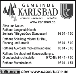 Gemeinde Karlsbad hat montags bis mittwochs von 08:00 - 12:00 Uhr, donnerstags von 14:00 - 18:00 Uhr und freitags von 08:00 - 12:00 Uhr geöffnet.
