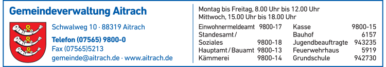 Gemeindeverwaltung Aitrach hat montags bis dienstags von 08:00 - 12:00 Uhr, mittwochs von 08:00 - 12:00 Uhr, 15:00 - 18:00 Uhr und 08:00 - 12:00 Uhr und donnerstags bis freitags von 08:00 - 12:00 Uhr geöffnet.