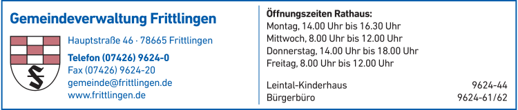 Gemeindeverwaltung Frittlingen hat montags von 14:00 - 16:30 Uhr, mittwochs von 08:00 - 12:00 Uhr, donnerstags von 14:00 - 18:00 Uhr und freitags von 08:00 - 12:00 Uhr geöffnet.