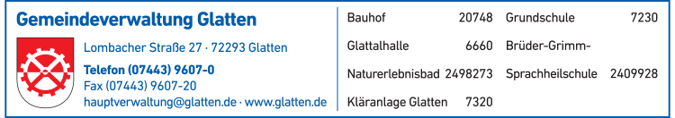 Die Adresse von Gemeindeverwaltung Glatten lautet: Lombacher Str. 27, 72293 Glatten