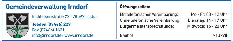 Die Adresse von Gemeindeverwaltung Irndorf lautet: Eichfelsenstr. 22, 78597 Irndorf