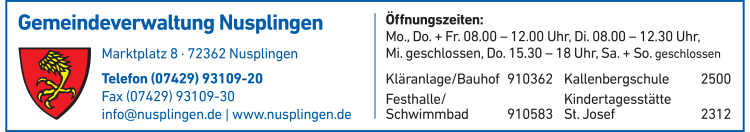 Wie sind die Öffnungszeiten von Gemeindeverwaltung Nusplingen?