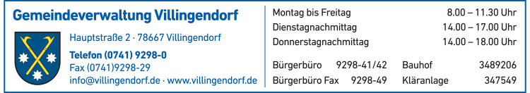 Die Adresse von Gemeindeverwaltung Villingendorf lautet: Hauptstr. 2, 78667 Villingendorf