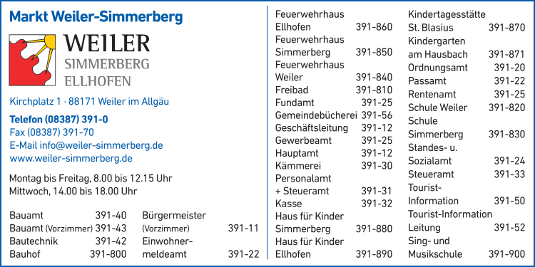 Gemeindeverwaltung Weiler-Simmerberg hat montags bis dienstags von 08:00 - 12:15 Uhr, mittwochs von 14:00 - 18:00 Uhr und 08:00 - 12:15 Uhr und donnerstags bis freitags von 08:00 - 12:15 Uhr geöffnet.
