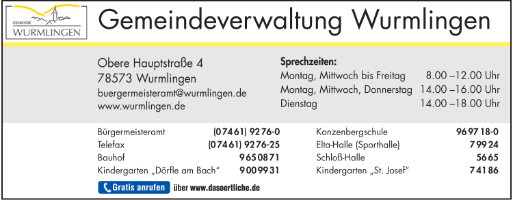 Gemeindeverwaltung Wurmlingen hat montags von 08:00 - 12:00 Uhr und 14:00 - 16:00 Uhr, dienstags von 14:00 - 18:00 Uhr, mittwochs bis donnerstags von 08:00 - 12:00 Uhr und 14:00 - 16:00 Uhr und freitags von 08:00 - 12:00 Uhr geöffnet.