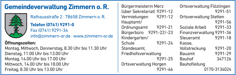 Gemeindeverwaltung Zimmern o. R. hat montags von 08:30 - 11:30 Uhr und 14:00 - 17:00 Uhr, dienstags von 11:00 - 13:00 Uhr, mittwochs von 08:30 - 11:30 Uhr und 14:00 - 18:00 Uhr, donnerstags von 08:30 - 11:30 Uhr und freitags von 08:30 - 13:00 Uhr geöffnet.