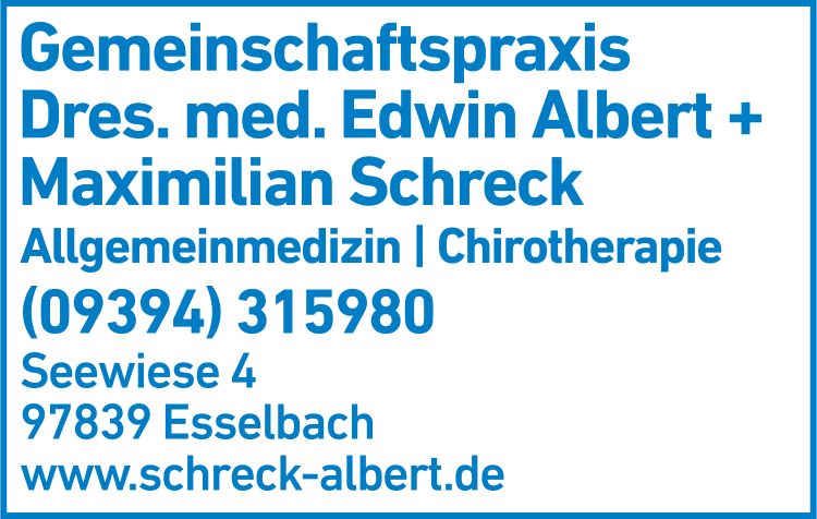 Die Adresse von Gemeinschaftspraxis Edwin Albert und Maximilian Schreck Dres. med. lautet: Seewiese 4, 97839 Esselbach