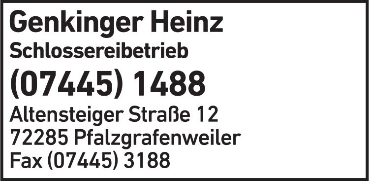 Die Adresse von Genkinger Heinz Schlosserei lautet: Altensteiger Str. 12, 72285 Pfalzgrafenweiler