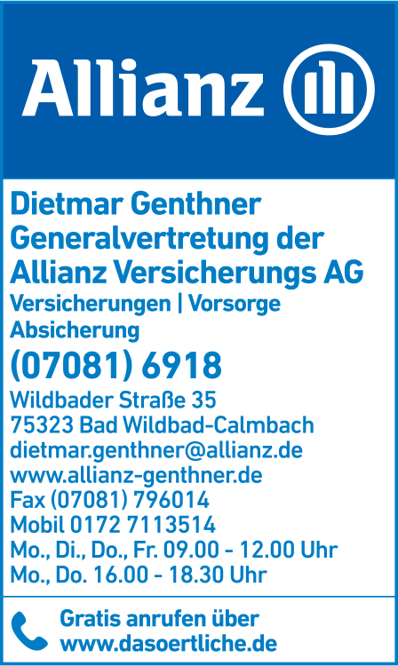 Genthner Dietmar Versicherungsbüro 07081 69 18 Bad Wildbad Wildbader Str. 35 75323 Calmbach