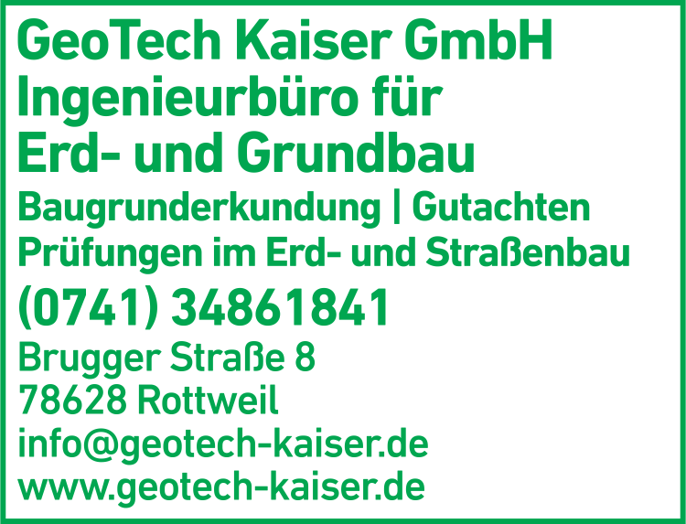 Die Adresse von GeoTech Kaiser GmbH lautet: Brugger Str. 8, 78628 Rottweil