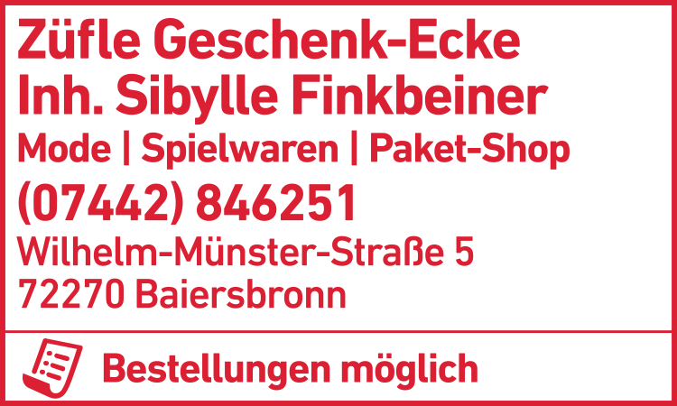 Geschenk-Ecke Züfle Inh. Sibylle Finkbeiner 07442 84 62 51 Baiersbronn Wilhelm-Münster-Str. 5 72270 de.teleauskunft.oetb.webapp2.detail.Graphic@31fdbb0c