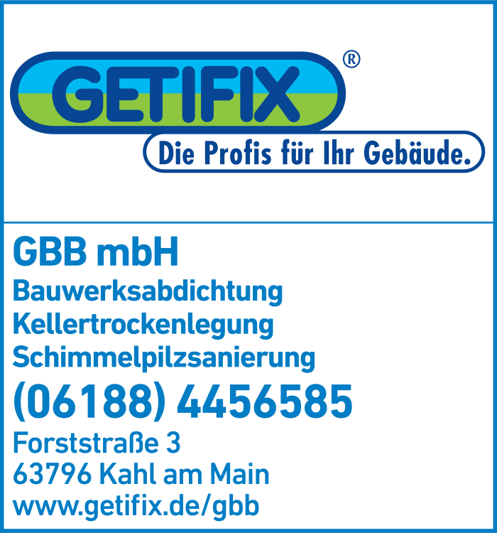 Die Adresse von Getifix GBB Gesellschaft für Bautenschutz + Bausanierung mbH lautet: Forststr. 3, 63796 Kahl am Main
