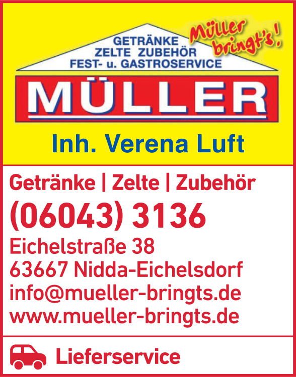 Die Adresse von Getränkevertrieb Müller Festzeltverleih lautet: Eichelstr. 38, 63667 Nidda-Eichelsdorf