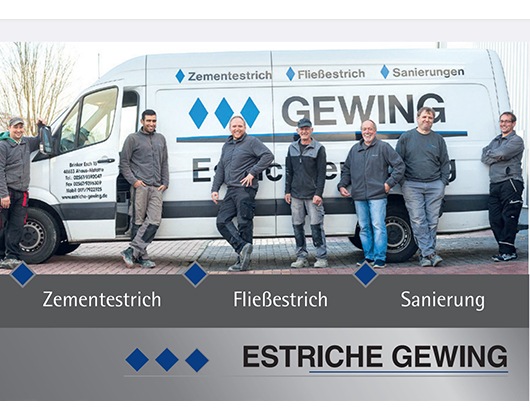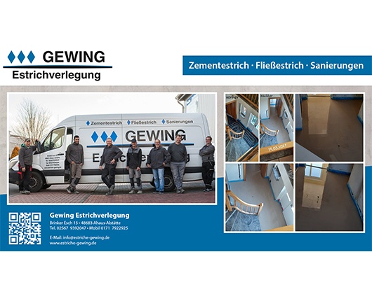 | Estriche Gewing ist ein familiengeführter Handwerksbetrieb aus Ahaus-Alstätte mit langjähriger Erfahrung in der Verlegung von Zement- und Fließestrich. Das Unternehmen steht für handwerkliche Qualität, hochwertige Materialien und faire Preise. Ob Wohnhäuser, Bürogebäude oder öffentliche Einrichtungen wie Schulen und Kitas u2013 Estriche Gewing setzt Projekte zuverlässig und professionell um.<br><br># Unsere Leistungen u2013 Qualität und Kompetenz für Ihren Boden<br><br>u2022 *Zementestrich*: Robuster Estrich mit hoher Früh- und Endfestigkeit, ideal für vielfältige Anwendungen. <br>u2022 *Fließestrich* Selbstnivellierender Estrich, besonders geeignet f. Fußbodenheizungen. <br>u2022 *Wärme- und Trittschalldämmung*: Optimale Lösungen für Komfort u. Energieeffizienz. <br>u2022 *Sanierungen*: Fachgerechte Estricharbeiten im Rahmen von Gebäudemodernisierungen. <br><br>Estriche Gewing berät Sie individuell und setzt Ihre Wünsche mit handwerklicher Präzision um. Vertrauen Sie auf unsere Expertise für langlebige und hochwertige Ergebnisse. |