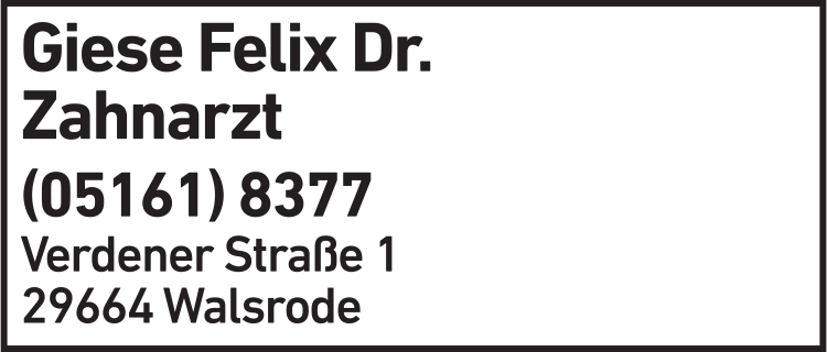 Die Adresse von Giese Felix Dr. Zahnarzt lautet: Verdener Str. 1, 29664 Walsrode