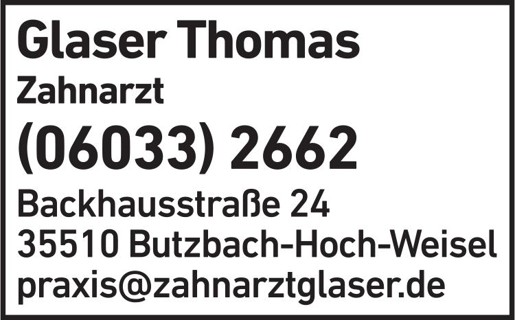 Die Adresse von Glaser Thomas Zahnarztpraxis lautet: Backhausstr. 24, 35510 Butzbach