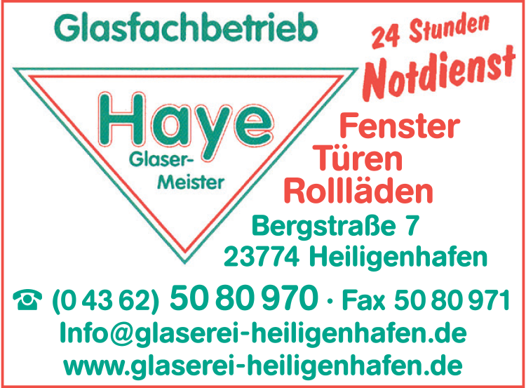 Die Adresse von Glaserei Haye lautet: Bergstr. 7, 23774 Heiligenhafen