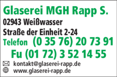 Die Adresse von Glaserei MGH Rapp S. lautet: Straße der Einheit 2-24, 02943 Weißwasser