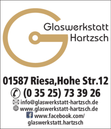 Die Adresse von Glaswerkstatt Hartzsch lautet: Hohe Str. 12, 01587 Riesa