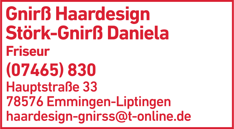 Die Adresse von Gnirß Haardesign, Störk-Gnirß Daniela lautet: Hauptstr. 33, 78576 Emmingen-Liptingen