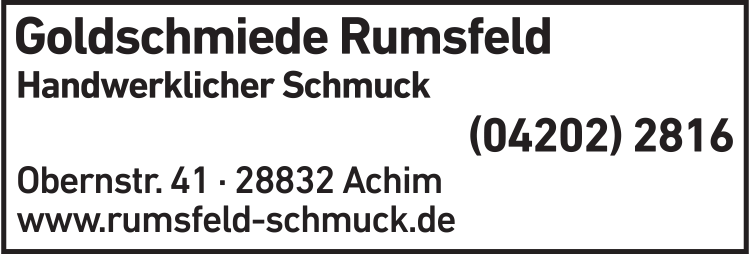 Die Adresse von Goldschmiede Rumsfeld lautet: Obernstr. 41, 28832 Achim