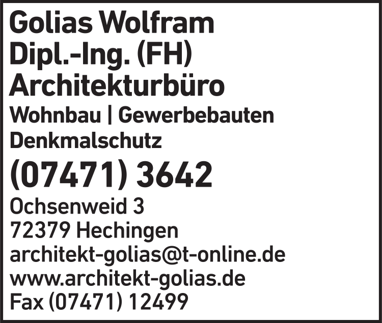 Die Adresse von Golias Wolfram Dipl. - Ing. (FH) Architekt lautet: Ochsenweid 3, 72379 Hechingen