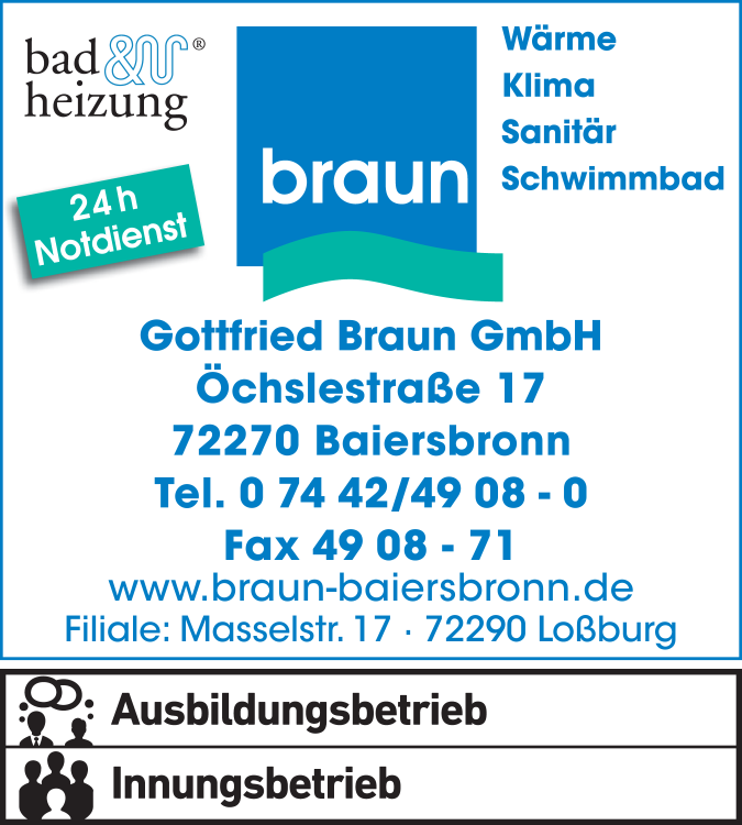 Die Adresse von Gottfried Braun GmbH Heizung-Lüftung-Sanitär Wärme, Klima lautet: Öchslestr. 17, 72270 Baiersbronn