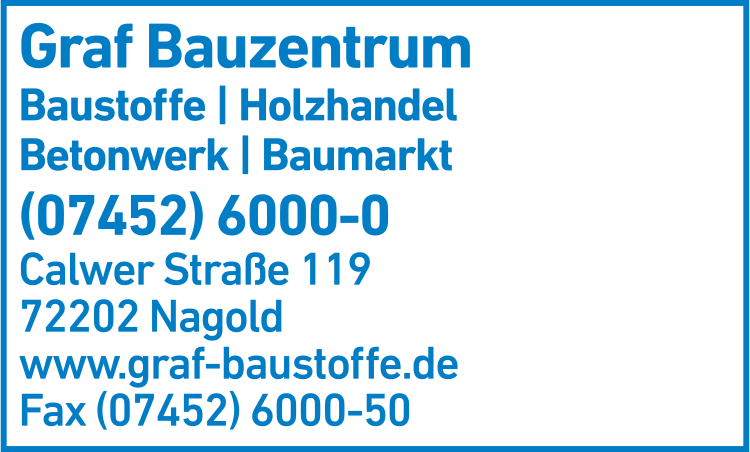 Die Adresse von Graf Bauzentrum Baumarkt und Baustoffhandel lautet: Calwer Str. 119, 72202 Nagold