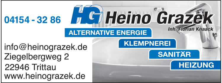 Die Adresse von Grazek Heino Heizungs- u. Sanitärtechnik lautet: Ziegelbergweg 2, 22946 Trittau