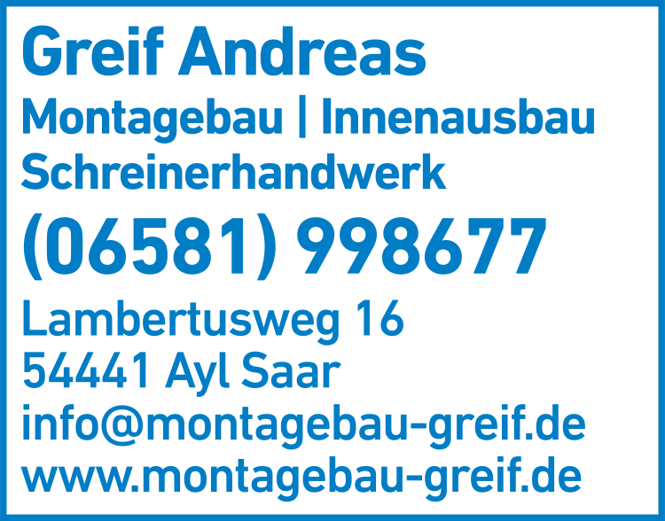 Die Adresse von Greif Andreas Montagebau lautet: Lambertusweg 16, 54441 Ayl