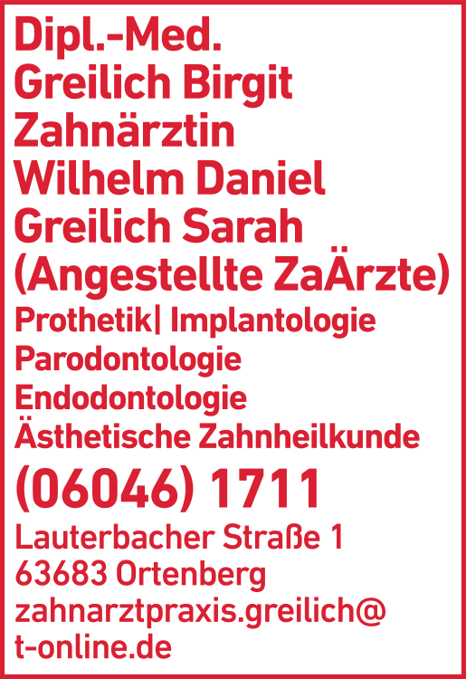 Greilich Birgit Dipl. - Med., Wilhelm Daniel, Greilich Sarah Zahnärztin 06046 17 11 Ortenberg Lauterbacher Str. 1 63683