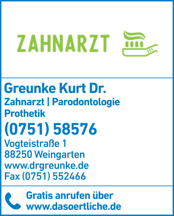 Die Adresse von Greunke Kurt Dr. Zahnarzt lautet: Vogteistr. 1, 88250 Weingarten