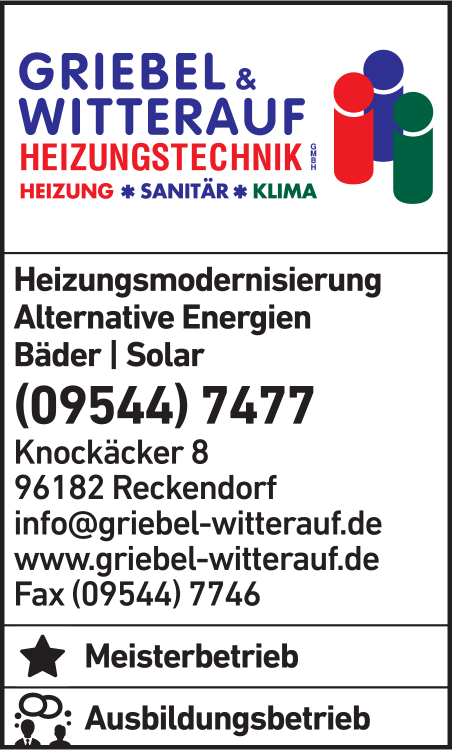 Die Adresse von Griebel & Witterauf Heizung lautet: Knockäcker 8, 96182 Reckendorf