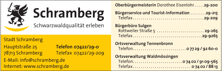 Zusatzinformationen: Rathaus, Schulen, Bürgermeister, Ortsverwaltung, Bürgerservice, Hallenbad, Touristik-Information, Freibad, Gemeindeverwaltung, Tennenbronn, Sulgen, Waldmössingen, Bürgerbüro, Bauhof, Schramberg, Standesamt, Meldeamt, Bürgerbus, Bauplätze, Personalausweis, Kinderbetreuung, Veranstaltungen, Oberbürgermeister, Familienferien