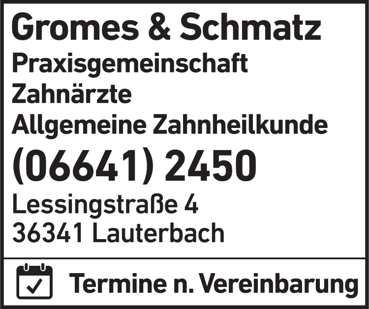 Die Adresse von Gromes Ulrich, Schmatz Susanne Zahnärzte lautet: Lessingstr. 4, 36341 Lauterbach