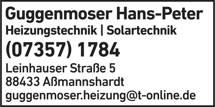 Guggenmoser Hans-Peter Heizungstechnik 07357 17 84 Schemmerhofen-Aßmannshardt Leinhauser Str. 5 88433 Aßmannshardt