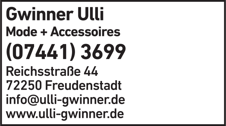 Die Adresse von Gwinner Ulli Mode und Accessoires lautet: Reichsstr. 44, 72250 Freudenstadt
