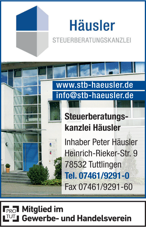 Die Adresse von Häusler Steuerberatungskanzlei lautet: Heinrich-Rieker-Str. 9, 78532 Tuttlingen