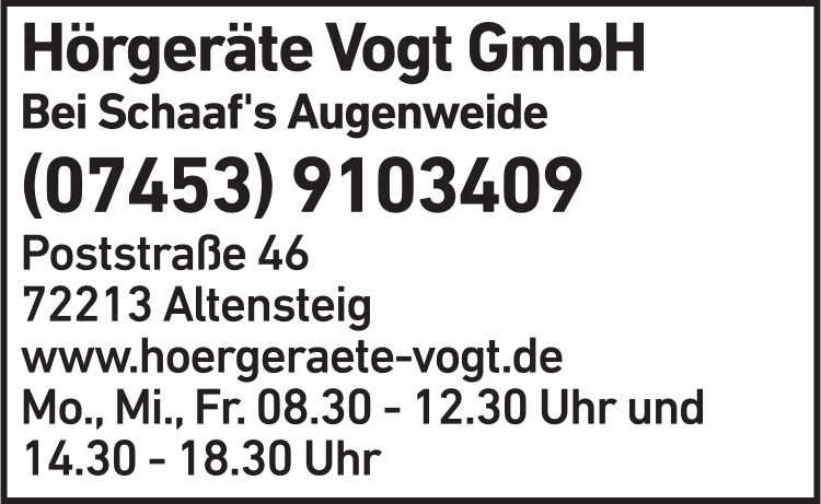 Hörgeräte Vogt GmbH 07453 9 10 34 09 Altensteig Poststr. 46 72213