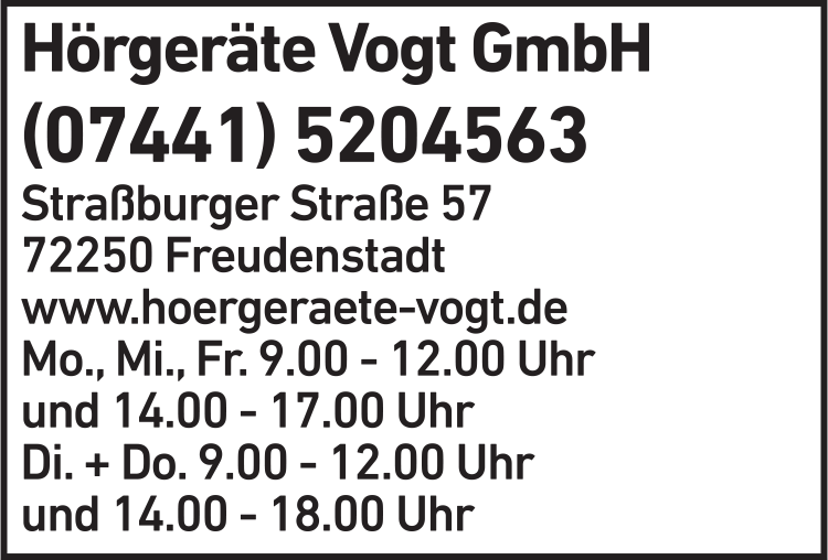 Die Adresse von Hörgeräte Vogt GmbH lautet: Straßburger Str. 57, 72250 Freudenstadt