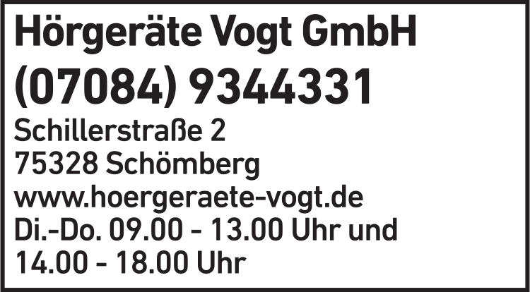 Die Adresse von Hörgeräte Vogt GmbH lautet: Schillerstr. 2, 75328 Schömberg