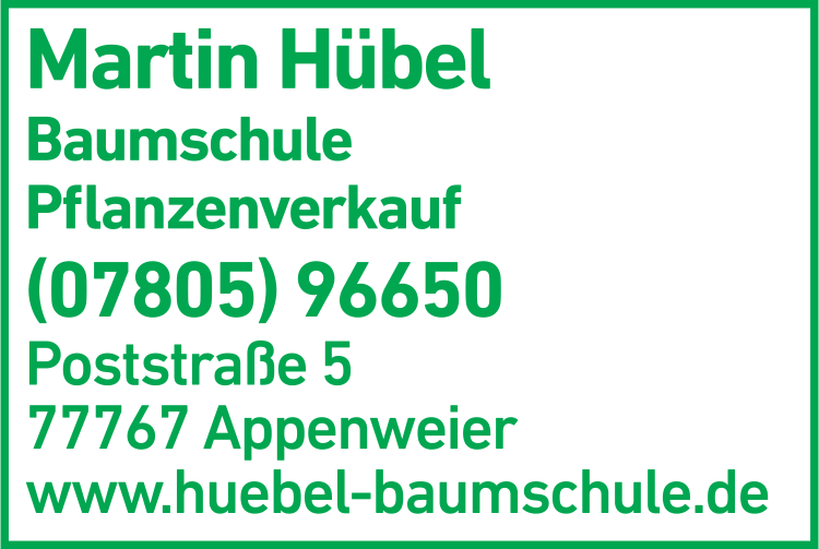 Die Adresse von Hübel Martin Baumschule lautet: Poststr. 5, 77767 Appenweier
