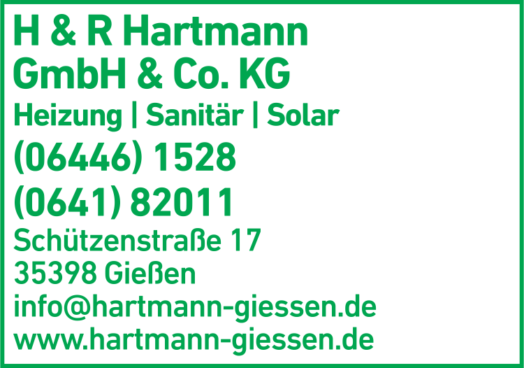 Die Adresse von H. & R. Hartmann GmbH & Co. KG lautet: Großer Garten 2, 35644 Hohenahr-Erda