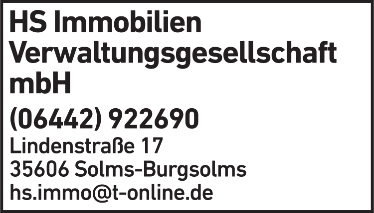 Die Adresse von HS Immobilien Verwaltungsgesellschaft mbH lautet: Lindenstr. 17, 35606 Solms-Burgsolms
