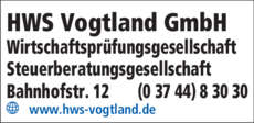 Die Adresse von HWS Vogtland GmbH lautet: Bahnhofstr. 12, 08209 Auerbach