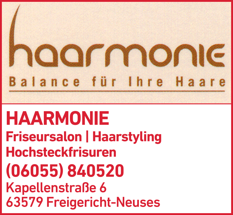 Die Adresse von Haarmonie Balance für Ihre Haare Friseur lautet: Kapellenstr. 6, 63579 Freigericht