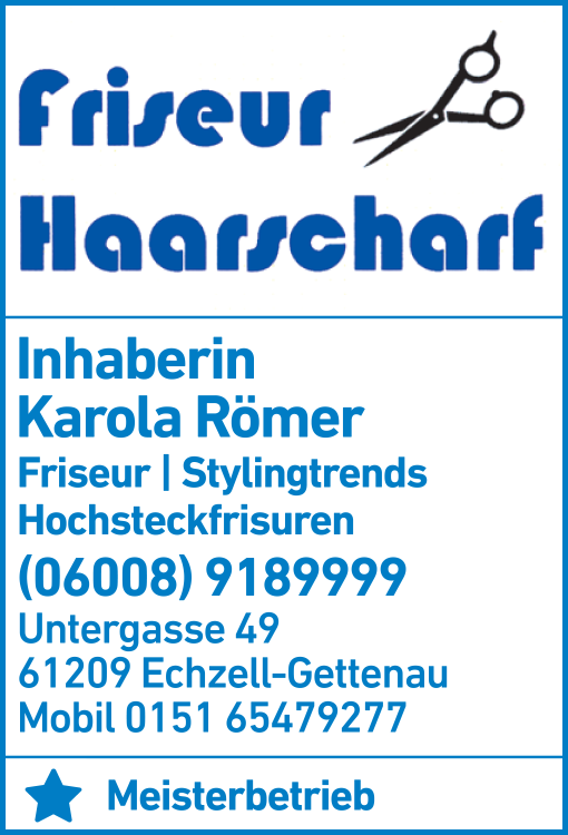Haarscharf Inh. Karola Römer Friseur 06008 9 18 99 99 Echzell Untergasse 49 61209 Gettenau de.teleauskunft.oetb.webapp2.detail.Graphic@4dd0c078